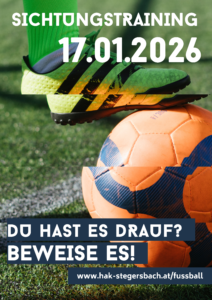 Du hast Talent und Freude am Fußball? Zeig’s uns! Am 17. Jänner ab 13 Uhr findet das Sichtungstraining der Herren am Campus der BHAK/BHAS Stegersbach statt. Bitte das komplette Fußballgewand